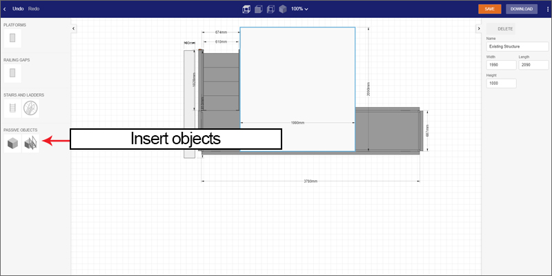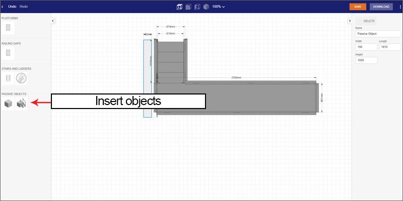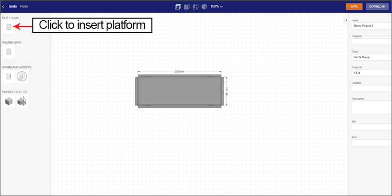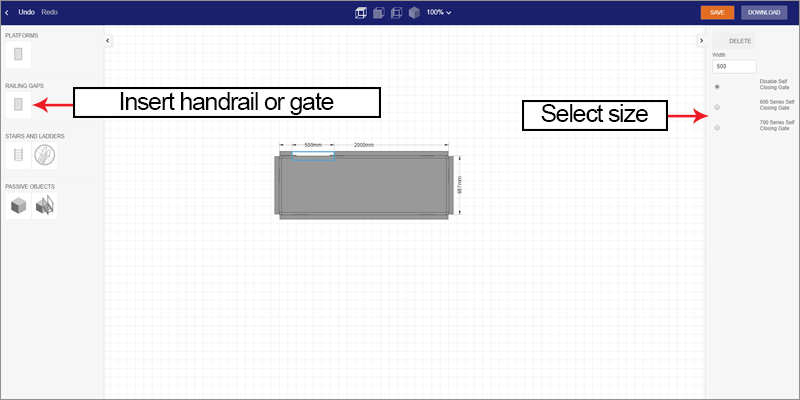 With the platform selected, click to add handrail or a self-closing gate. Choose from either 600 series or 700 series size gates (on the right side of the screen) to suit the application.