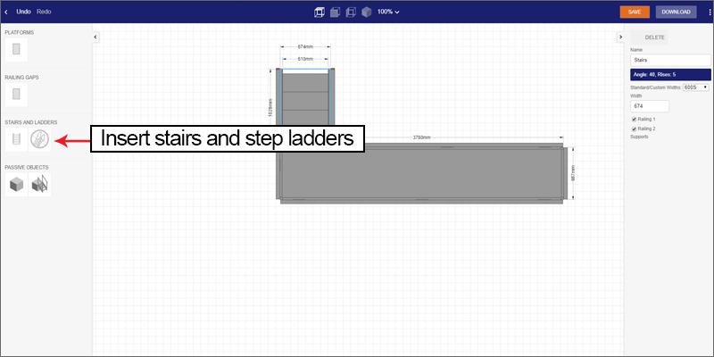 Select the platform and click to add stairs and step ladders. Choose from standard or custom widths.
